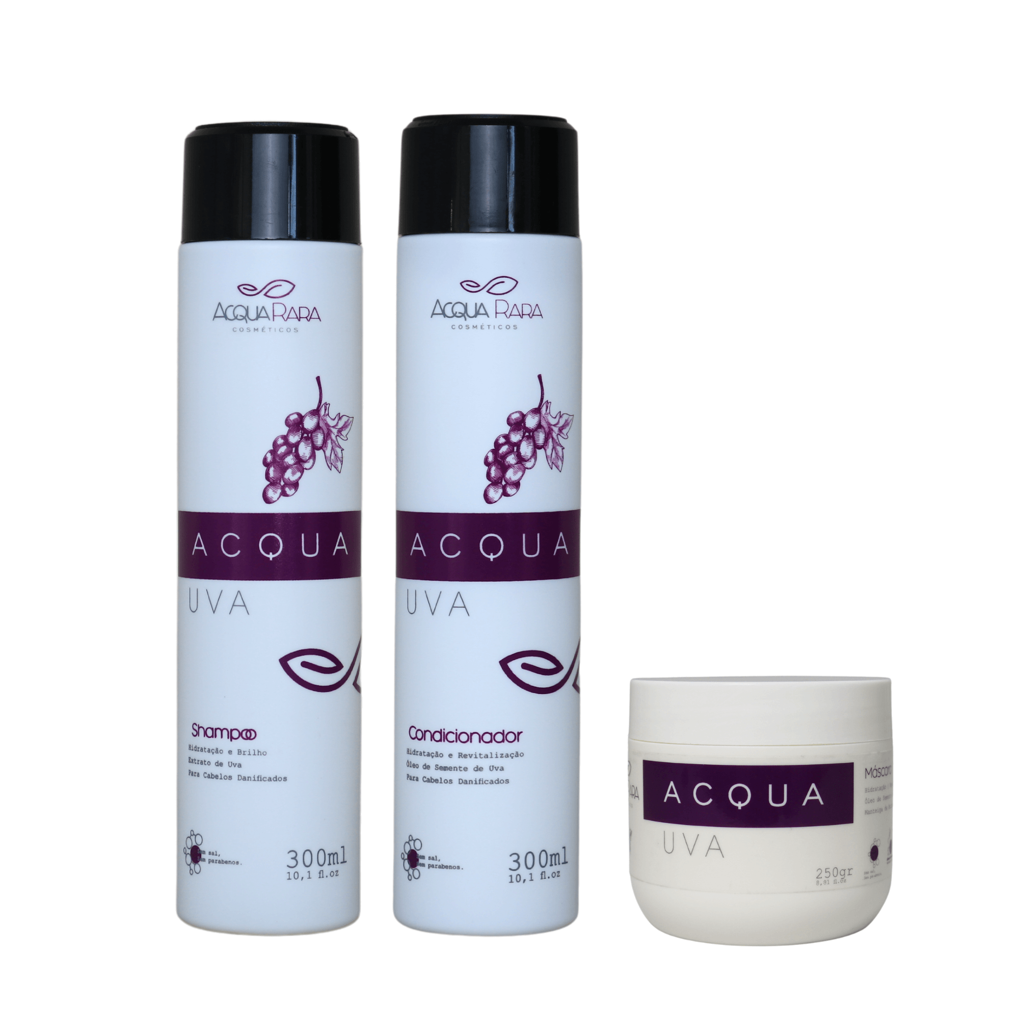 O Shampoo Acqua Uva, contém extrato de uva, rico em antioxidantes e vitamina E, traz recuperação e hidratação de pontas ressecadas ou danificadas por processos químicos, atua na prevenção de queda dos fios, evita que se tornem quebradiços e auxilia no crescimento. Evita escamações e doenças no couro cabeludo.